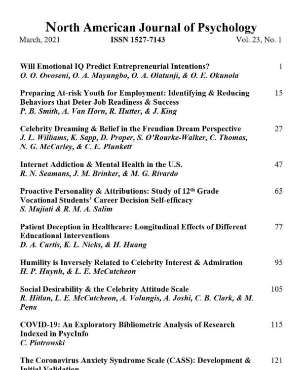 As a result of our Research Study focused on “Celebrity Dreaming and Belief in the Freudian Dream Perspective”, their work is being published in the North American Journal or Psychology Volume 23 Issue 1 beginning on Page 27 in March 2021.