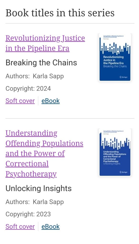 Dr. Karla’s dedication to advancing the field of offending populations and correctional psychotherapy is evident throughout the series. Her commitment to evidence-based practice, ethical considerations, and cultural sensitivity ensures that these publications are of the highest quality. She encourages interdisciplinary collaboration, making these books relevant for professionals from a range of disciplines, including psychology, social work, counseling, and criminal justice.