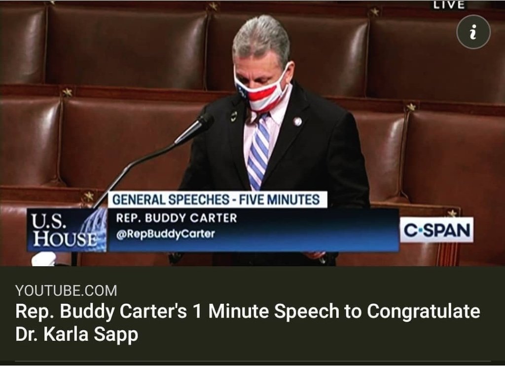 To View the 1 Minute Congressional Speech: Congressman E. Buddy Carter Congratulates Dr. Karla Sapp on the US House Floor