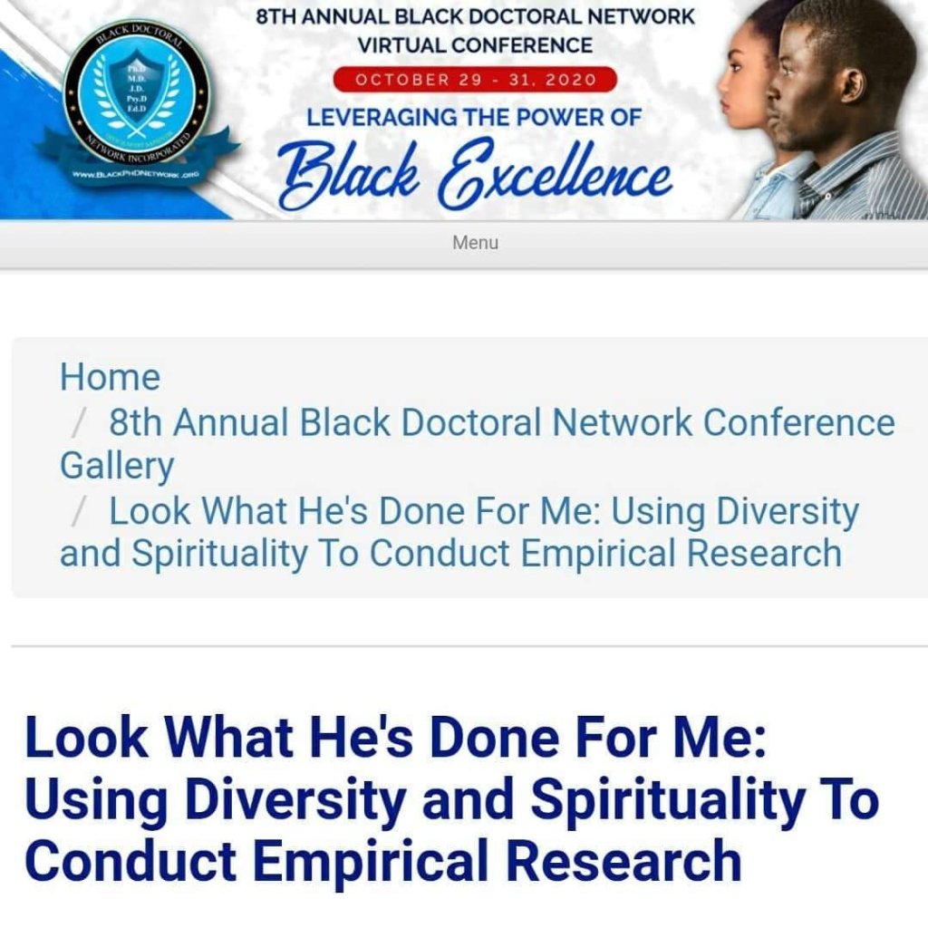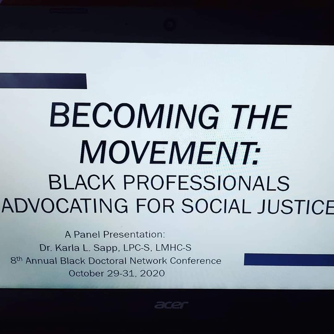 Dr. Karla’s 8th Annual Black Doctoral Network Conference Panel Presentation “Becoming The Movement: Black Professionals Advocating for Social Justice” was presented on October 31, 2020 during the “Look What He’s Done For Me: Using Diversity and Spirituality to Conduct Empirical Research” Panel with 2 amazing Panelist!