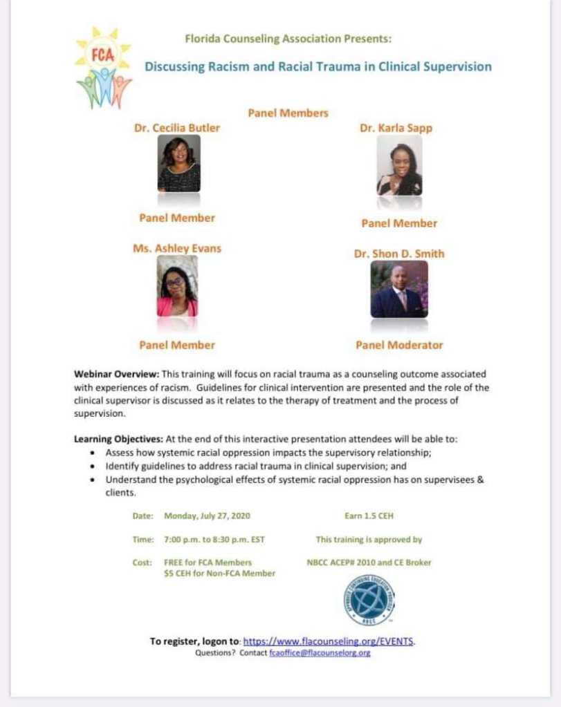 Dr. Sapp served as a Panelist on July 27, 2020 during Florida Counseling Association “Discussing Race and Racial Trauma in Clinical Supervision”