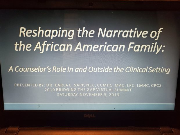 On Saturday, November 9, 2019, Dr. Karla had the privilege of starting off the NBCC 2019 Bridging the Gap Virtual Summit, hosted by Mental Health Academy, with her presentation, “Reshaping the Narrative of the African American Family: A Counselor’s Role In and Outside of the Clinical Setting”.