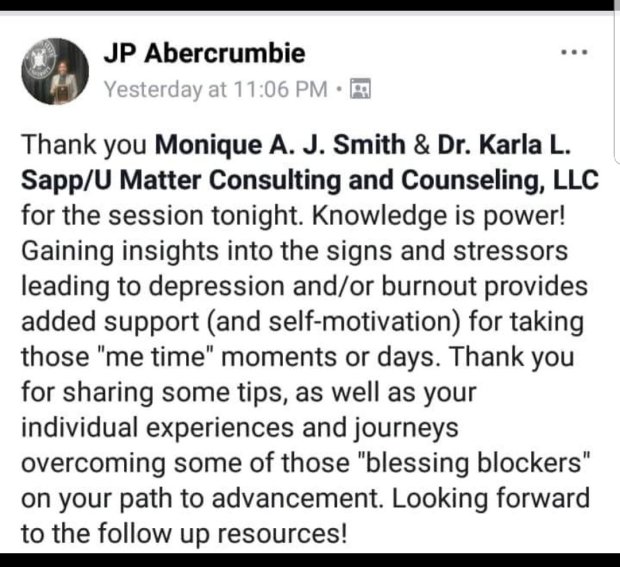 On May 19, 2018, Dr. Karla joined the Advancement for Athletic Administrators Academy, hosted by Monique A. J. Smith for Live Session discussing the difference between Burnout and Depression, as well as offer preventive and recovery strategies.
