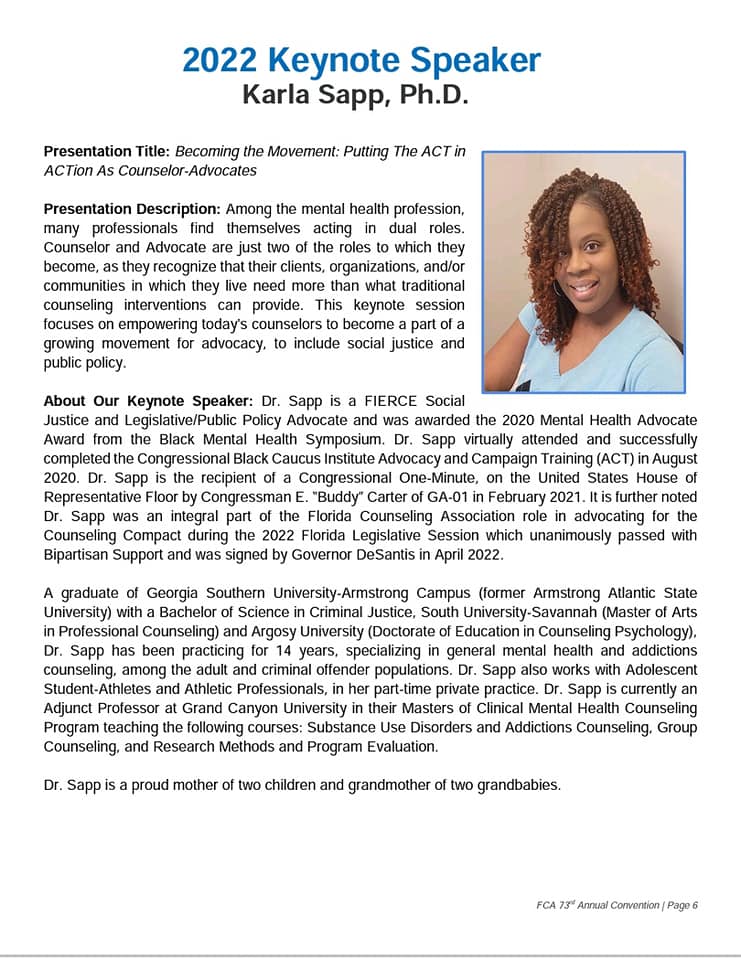 Florida Counseling Association held their 73rd Annual Convention virtually from Thursday, October 27 through today, Saturday, October 29, 2022 and Dr. Karla was honored to be featured as the Counseling Association Convention Keynote Speaker.