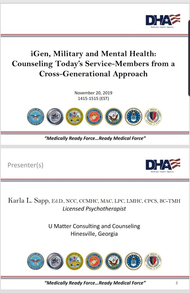 The presentation was entitled: “iGen, Military, and Mental Health: Counseling Today’s Service-Members from a Cross-Generational Approach”.